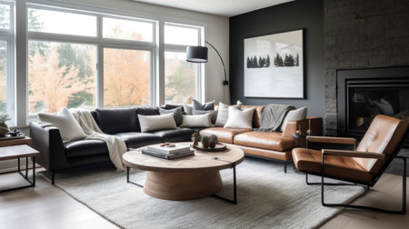 Living room decor, home interior design . Modern Minimal style with Fireplace decorated with Leather and Wood material . Generative AI AIG26.