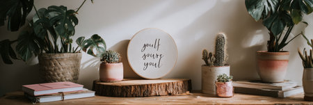 Bright and inviting indoor setting featuring various plants, a personalized wood sign, and cacti displayed on a rustic wooden table.