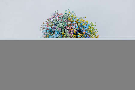 Bouquet of multi-colored gypsophila in a blue box with a bow on a gray background. top view