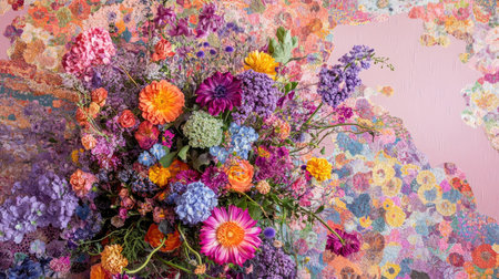 A vibrant collection of colorful flowers in a flat lay arrangement.