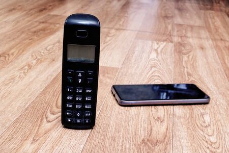 Old push-button telephone and modern smartphone close up on wooden table