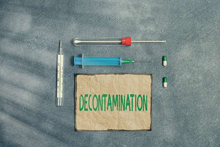 Text sign showing Decontamination. Business photo text neutralizing every presence of hazardous substances Set of medical equipment with notepad for professional health condition assessment