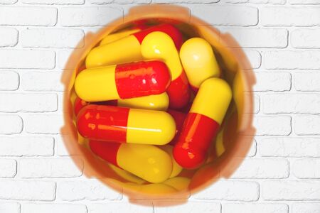 Red-yellow antibiotic capsule pills on yellow background. Prescription drug. Antibiotic drug resistance concept. Penicillin capsule pills. Pharmaceutical industry. Pharmaceutics. Pharmacy product.