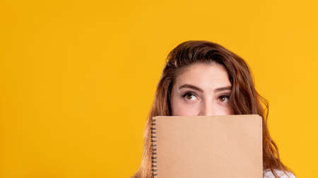 Curious woman portrait. Advertising background. Doubtful lady hiding behind blank notebook looking at copy space isolated on orange. Training course. Education learning. Master class.