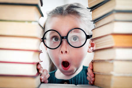 Emotional woman with eyeglass smiling and looking at camera while hiding her face behind a book against gray vintage wall background