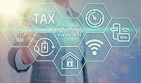 Conceptual hand writing showing Tax Deductions. Concept meaning an amount or cost that subtracted from someone s is income Grids and different icons latest digital technology concept