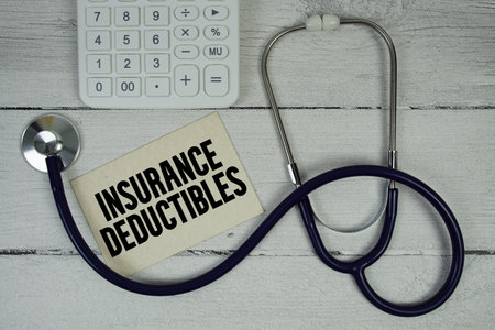 Insurance Deductibles text with Stethoscope and calculator on wooden background
