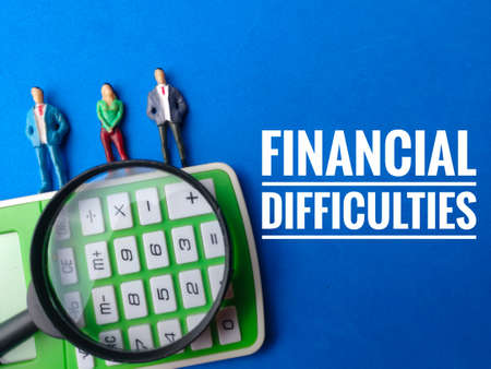Calculators, miniature people and magnifying glass with the words financial difficulties