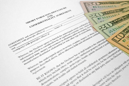 Close-up on few bucks on the top of a Short form non-disclosure and confidentiality agreement.