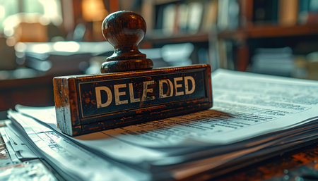 In a classic, wood-paneled office, a vintage rubber stamp rests on a stack of newspapers, its impression marking a final, authoritative decision.