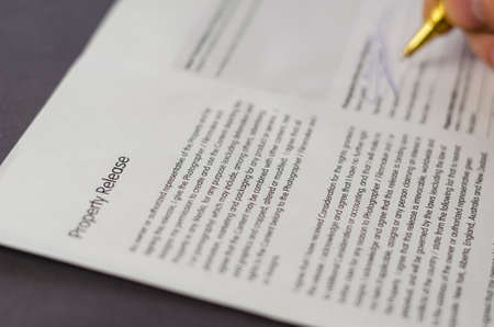 Hand fills out Property Release Form. A man's hand fills in the columns in a printed copy of the document with a gold pen. Selective focus.