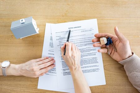 Top view of woman holding pen near document with rental agreement lettering and man with keys in hand