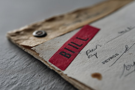 Close-up view of a vintage bill showing faded text and distinct red detailing on paper.
