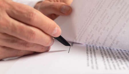 business man fills documents with a pen close up.