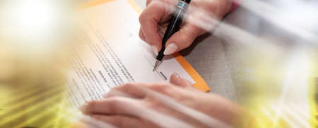 Hand of businesswoman signing a contract; multiple exposure