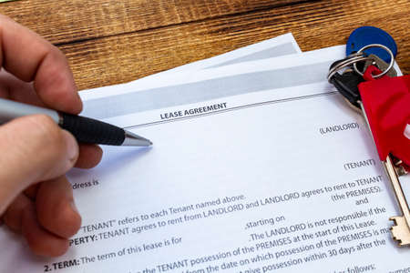 A lease agreement sits on a table alongside cash and keys, symbolizing a real estate transaction.