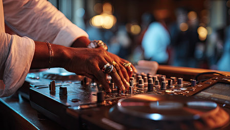 Close-up shows a DJ's hands operating an audio mixer, adjusting knobs and sliders. The image features a shallow depth of field, with soft lighting and a blurred background suggestive of a lively indoor environment. The visual style and composition are suitable for advertising, editorial, and commercial applications.