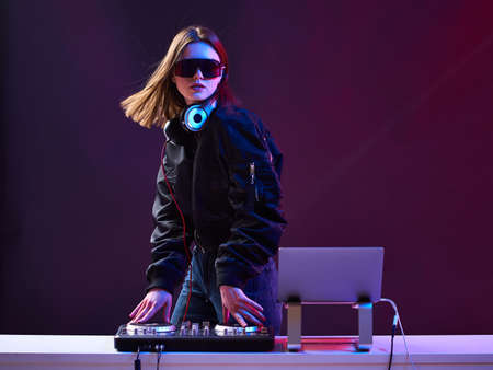 Stylish DJ girl with headphones and glasses on the bomber jacket mixes the music at the party and neon lights.