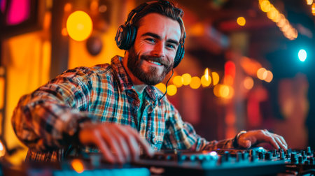 A talented DJ in a flannel shirt and beanie skillfully mixes tracks on a control panel under vibrant lights, creating an atmospheric backdrop highlighting the energy and artistry of nightlife.