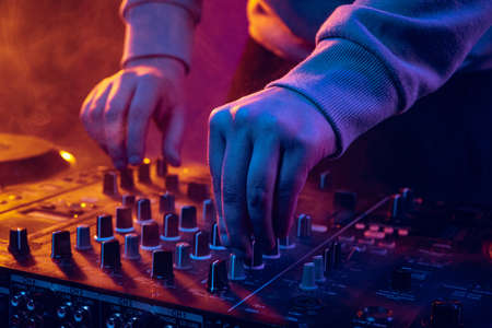 Close up view of DJs hands that working with music equipment in the club with neon lighting