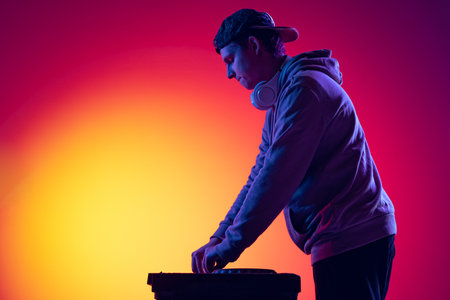 Portrait of young boy in casual cloth, dj making sounds with professional mixer at night club isolated over gradient pink yellow background