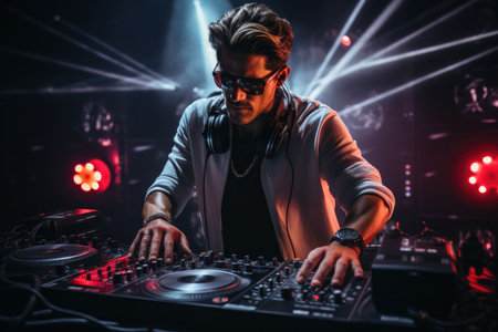 Charismatic disc jockey at the turntable. DJ plays on the best, famous CD players at nightclub during party. party concept, ai generative