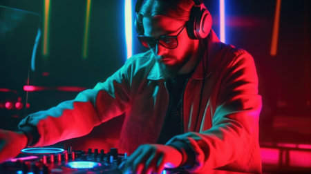 DJ skillfully spinning records with neon lights illuminating the atmosphere