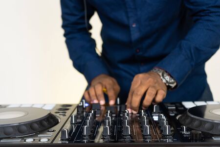 Close-up image of male hands, dj making sounds at night club party with professional sound mixer