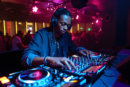 Focused DJ mixing tracks on a console at a club with vibrant blue and purple lighting.