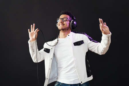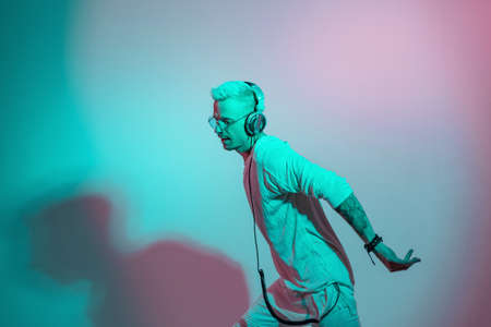Hipster man listens to music with headphones and dances in the studio. Boy dancer in creative pink and blue color