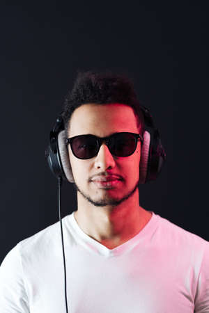 Fashion man model hipster with glasses listen to music in headphones in studio with pink blue light
