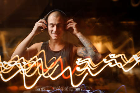 Male DJ in headphones works in a music club.