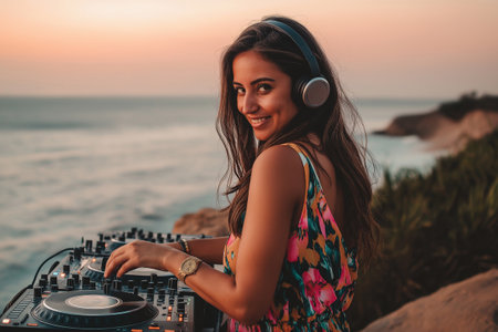 A beautiful Woman DJ, djing on top of a cliff, wearing headphones, facing Beachside,