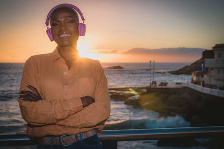 a black adult woman is listening to happy music, she sees the sunset and the sun rays with the sea in the background, she is relaxed and happy. Focus on the face
