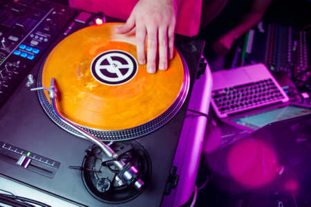 DJ in a nightclub mixing tracks. Hand close-up