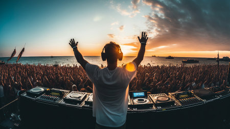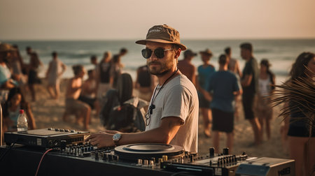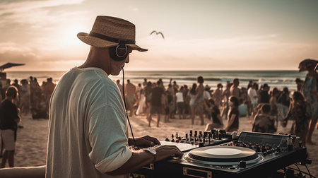 A DJ skillfully mixes tracks as the sun sets over the horizon, casting a warm glow on a beach party. The crowd dances and enjoys the music as vibrant colors fill the sky, creating an unforgettable experience.