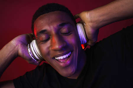 Smile Young African American man portrait wearing headphones and enjoy music over black Background. Red light reflection on face.