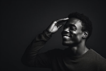close-up portrait of a charming handsome black guy with closed eyes in black and white light.