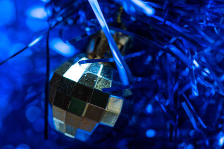 Shiny balloons and colorful tinsel elements of Christmas tree decoration, Close-up, selective focus. New year and christmas