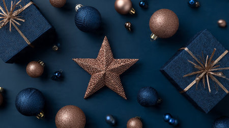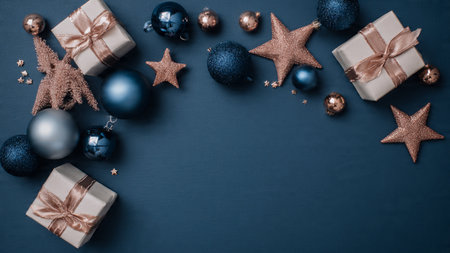 A curated top-view setup of luxurious ornaments and gift boxes, blending midnight blue textures with rose-gold shimmer.