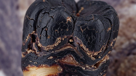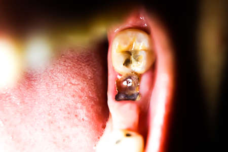Close-up showing close-up of a severely decayed and blackened human molar tooth with cracked enamel. High resolution image suitable for commercial use.