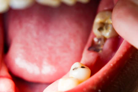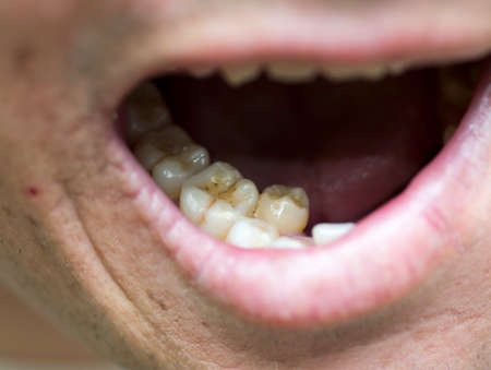 Plaque teeth cavities and paradontosis in the man's mouth. Dental decay problems and bad smile. Dentist treatment concept.