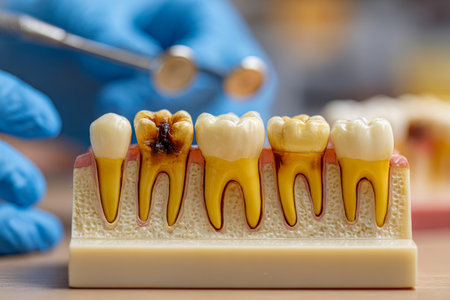 A dental professional in blue gloves uses a tool to illustrate the contrast between vibrant, healthy teeth and areas affected by decay on a detailed oral model, empha