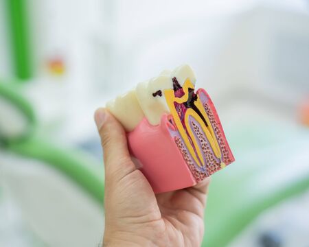 Anatomy of a dental model concept of a dentist cross section for education. The dentist holds a mock tooth in section in the office.