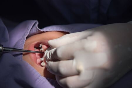 Dentist doing a dental treatment on a female patient. Surgery close-up.