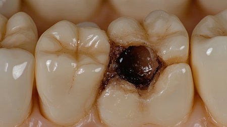 This detailed image showcases a close-up view of a cavity in a human tooth, emphasizing the effects of dental decay and the importance of oral health maintenance.