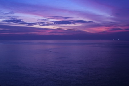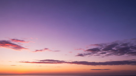 A serene sunset sky with a gradient of purple, pink, orange, and yellow hues, with wispy clouds above a calm ocean...