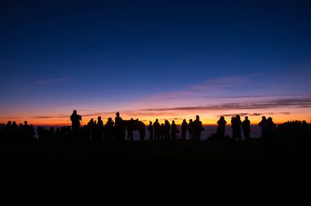 Silhouette of people at a panoramic viewpoint and looking at a beautiful sea, sunset. People unrecognizable.