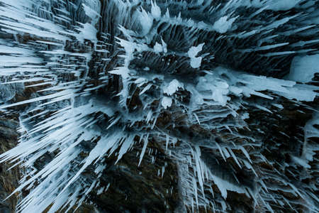 Huge icicles in an ice cave on the Lake Baikal in winter. Siberia, Russia.