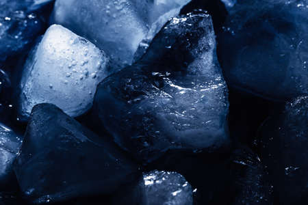 Ice cubes are scattered with water drops scattered on a blue background. close up. Refreshing ice.